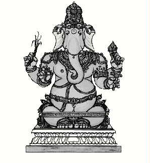 The "Valiant Warrior," Vira Ganapati, assumes a commanding pose. His 16 arms bristle with weapons, symbols of mind powers: a goad, discus, bow, arrow, sword, shield, spear, mace, a battleaxe, a trident and more. |